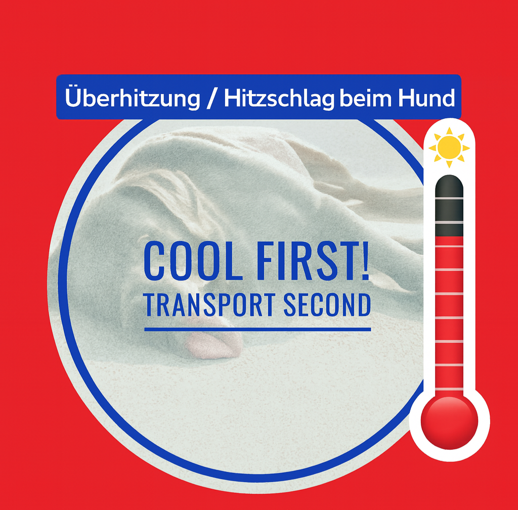Leider kursieren in Netz und auf Social Media immer noch überholte Ratschläge, die im Notfall Ihrem Hund das Leben kosten können. Bei Hitzschlag entscheidet eine schnelle, wirksame Kühlung über Leben und Tod. Das bedeutet: Im Idealfall übergießen des Hundes mit reichlich kaltem Wasser, besser noch Eintauchen in kaltes Wasser, mit Durchnässung bis auf die Haut. Erst nach dieser schnellstmöglichen, beherzten Kühlung gilt es, den Hund schnellstmöglich zum Tierarzt zu transportieren. Am besten bei weit geöffneten Fenstern und Durchzug und auf maximal gestellter Klimaanlage. Der Luftstrom führt die Wärme Luft vom Körper ab, die Verdunstungskälte senkt die Temperatur.