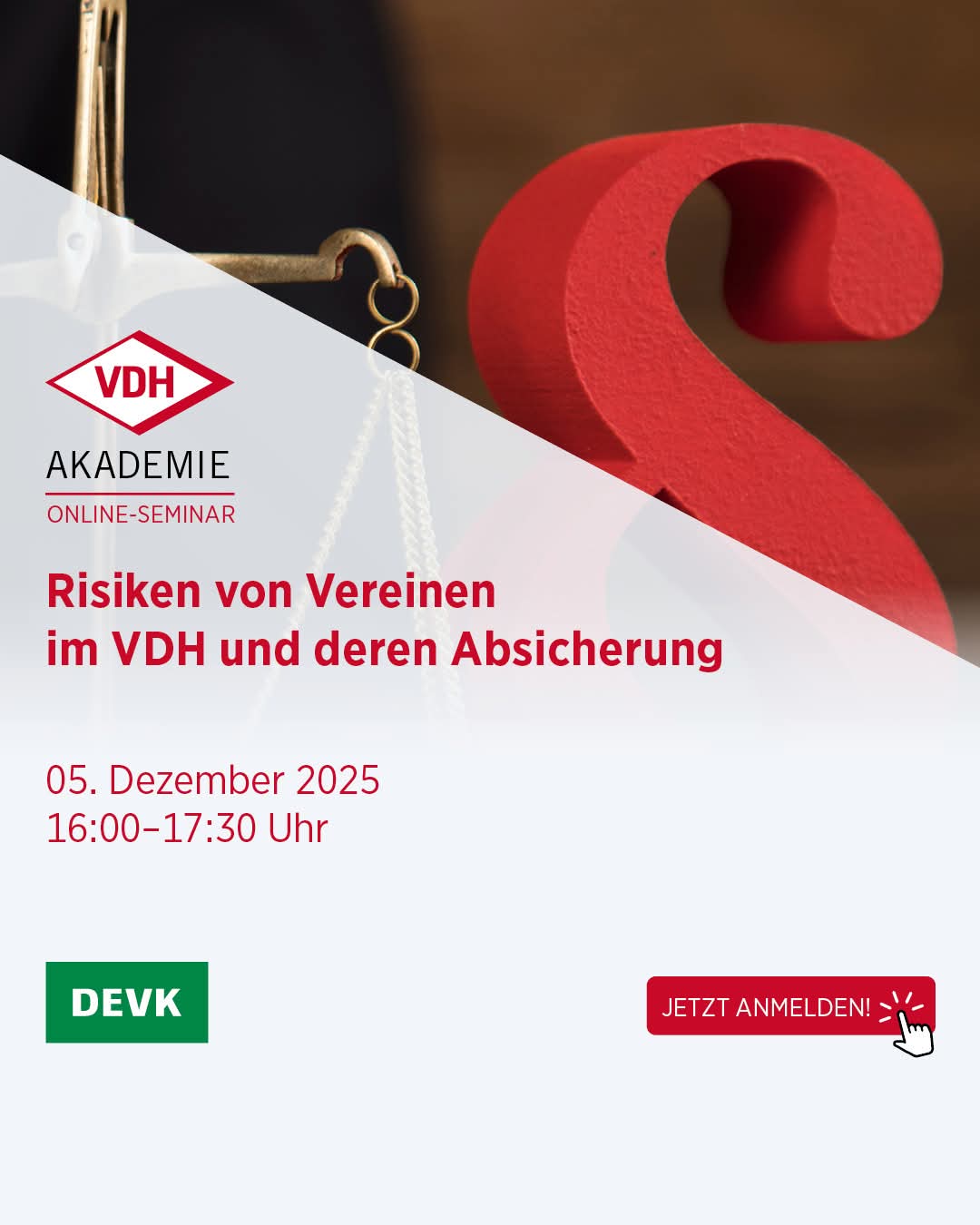 Am 05.12.25 von 16:00 Uhr – 17:30 Uhr bietet die DEVK ein kostenloses Online-Seminar zum Thema Risiken von Vereinen im VDH und deren Absicherung. Inhalt des Seminars sind unter anderem die Themenbereiche Vereinshaftplicht, Veranstalterhaftpflicht, Rechtsstreitigkeiten oder auch Unfälle. Es können auch spezielle Themenwünsche eingereicht werden. Die Teilnahme ist kostenlos.